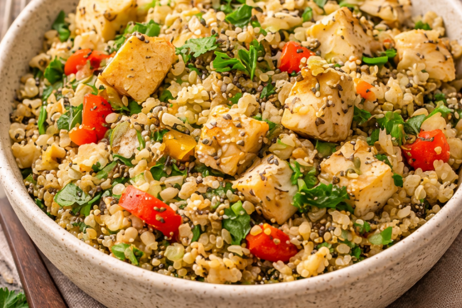 3. Cortar los pimientos y el tofu en cubos. En una sartén, agregar unas gotas de aceite y saltear los pimientos hasta que estén tiernos. Añadir el tofu y, por último, las semillas de chía.