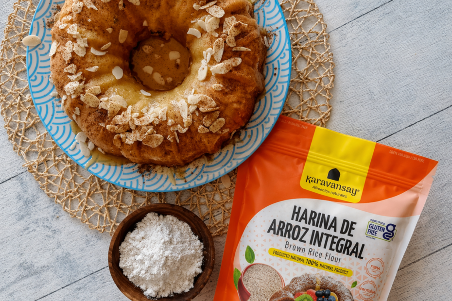 - En una ensaladera vierta la Harina de arroz integral Karavansay, el azúcar y las almendras. Añada el sustituto del huevo o los 3 huevos y vierta la leche amasando.